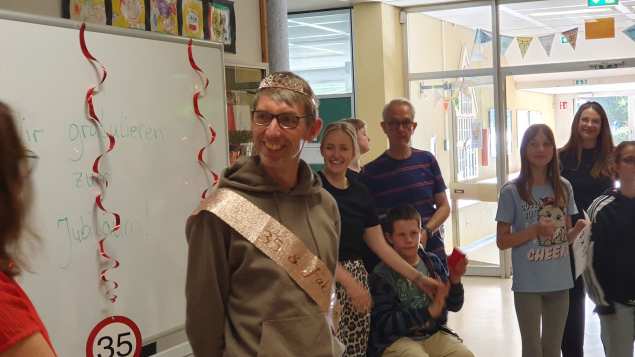 35 Jahre bei einem Arbeitgeber – das ist etwas ganz Besonderes und wurde in der Schule am Deich nun gleich zweimal gefeiert. Am 27.08. feierte Reinald Bittner sein Jubiläum und musste 35 Matheaufgaben lösen, bevor er ein kleines Geschenk zur Erinnerung an seinen Ehrentag erhielt. Kein Problem für ihn dank der Unterstützung von SchülerInnen und KollegInnen. Und einen Tag später wurde dann das Jubiläum von Doris Sobott-Hopmann gefeiert. Unterstützt von ihrem Mann spendierte sie leckeres Softeis. Das war nicht nur eine schöne Art, das 35jährige Dienstjubiläum zu feiern, sondern gleichzeitig auch ein Abschied, denn mit dem 31.8. verabschiedete sich die Kollegin in den Ruhestand.