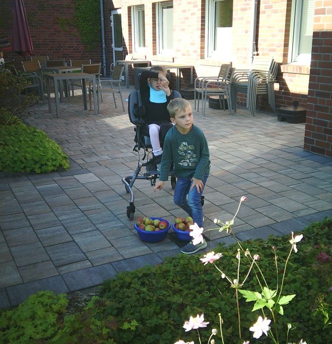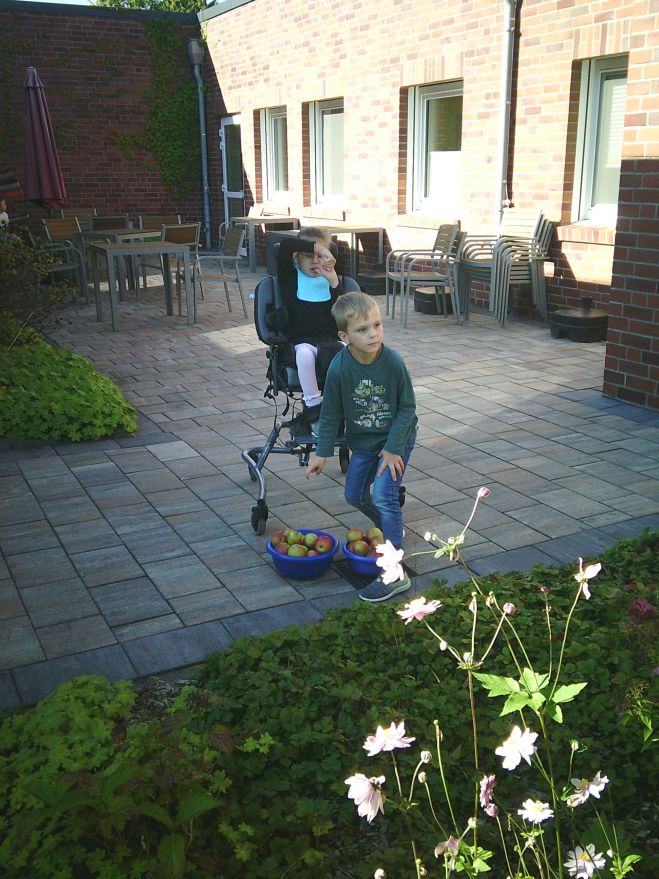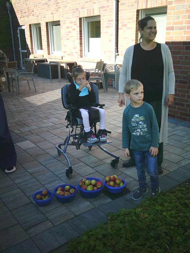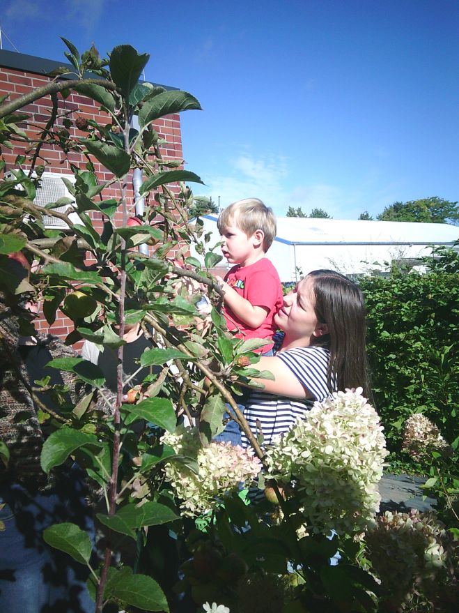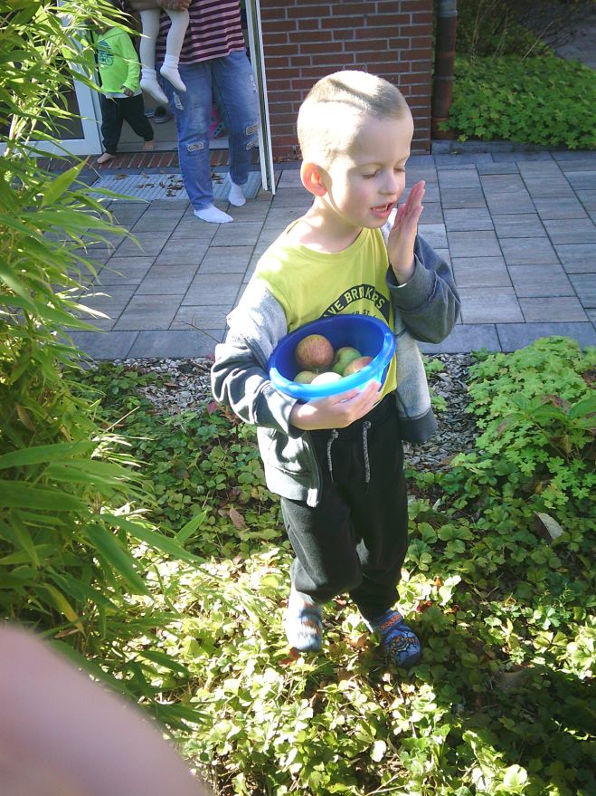 Unser Apfelbaum war prall gefüllt mit Äpfel. Die Kinder aus dem Kindergarten ernteten die Äpfel und backten leckeren Kuchen, Apfel-Pfannkuchen, Apfelmus und aßen sie so zum Nachtisch. Die Äpfel waren sehr lecker.