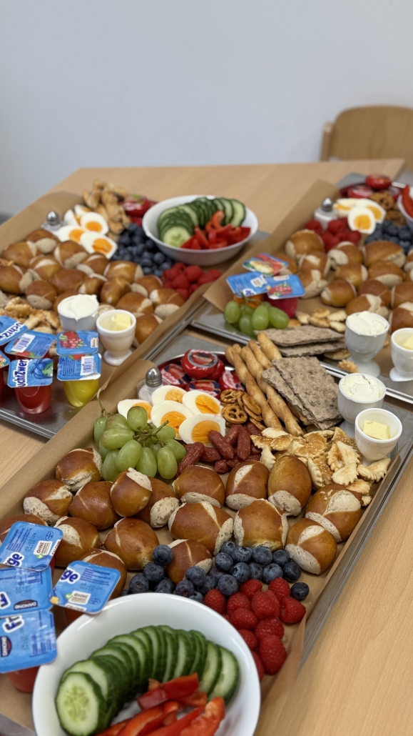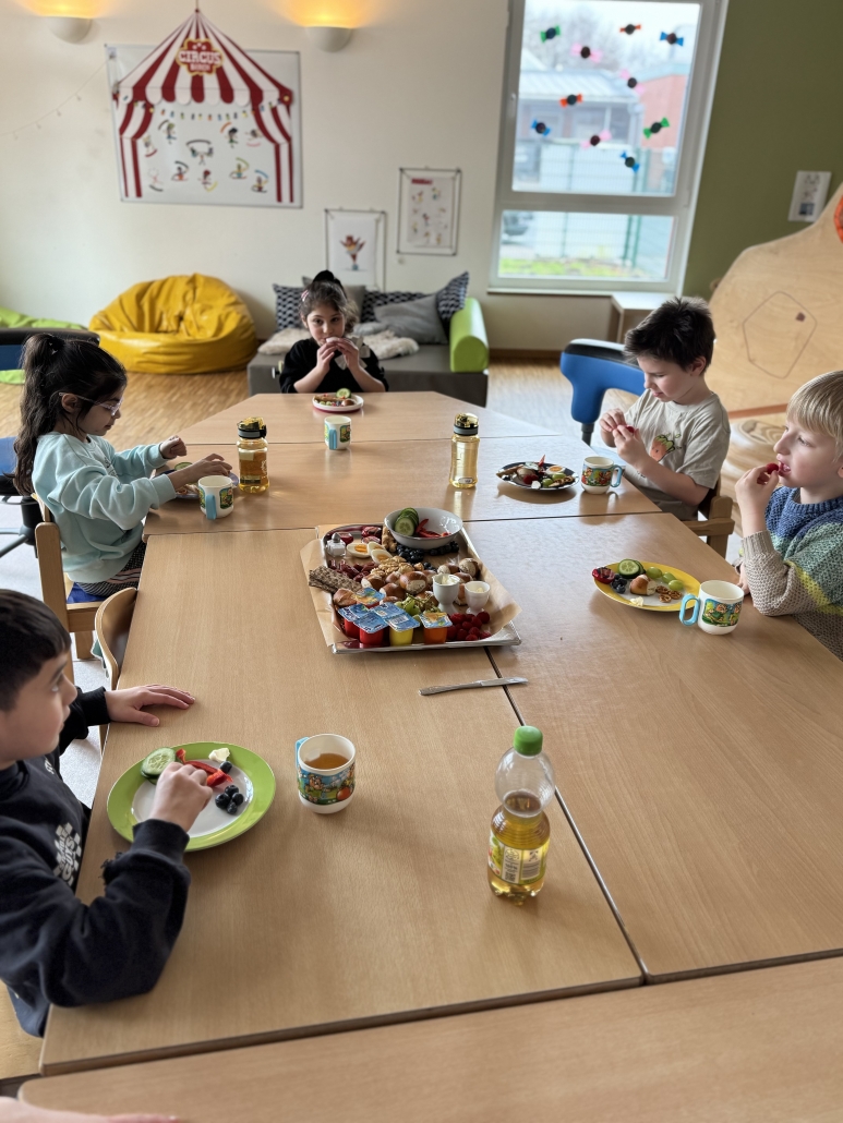 Jeden Monat machen wir ein leckeres Frühstücksbuffet. Heute mussten die Kinder nicht alleine ihre Brote schmieren, denn es gab ein gefülltes Tablett für die Hasen, Mäuse, Igel und Bären. Das fanden die Kinder toll und besonders lecker.