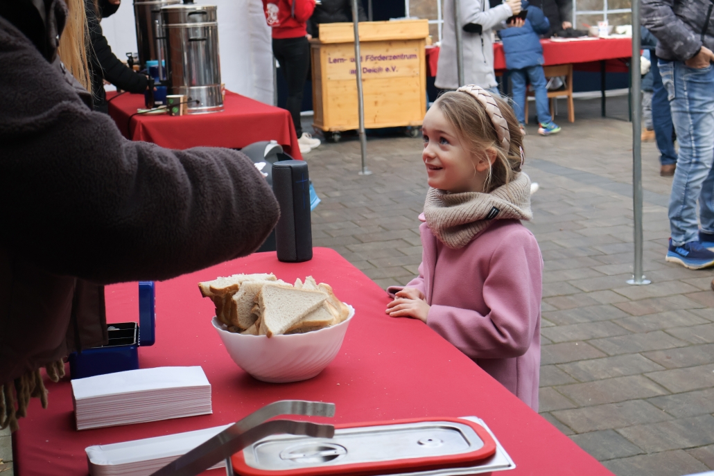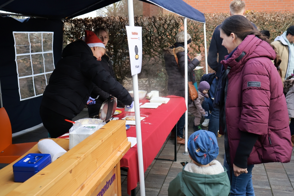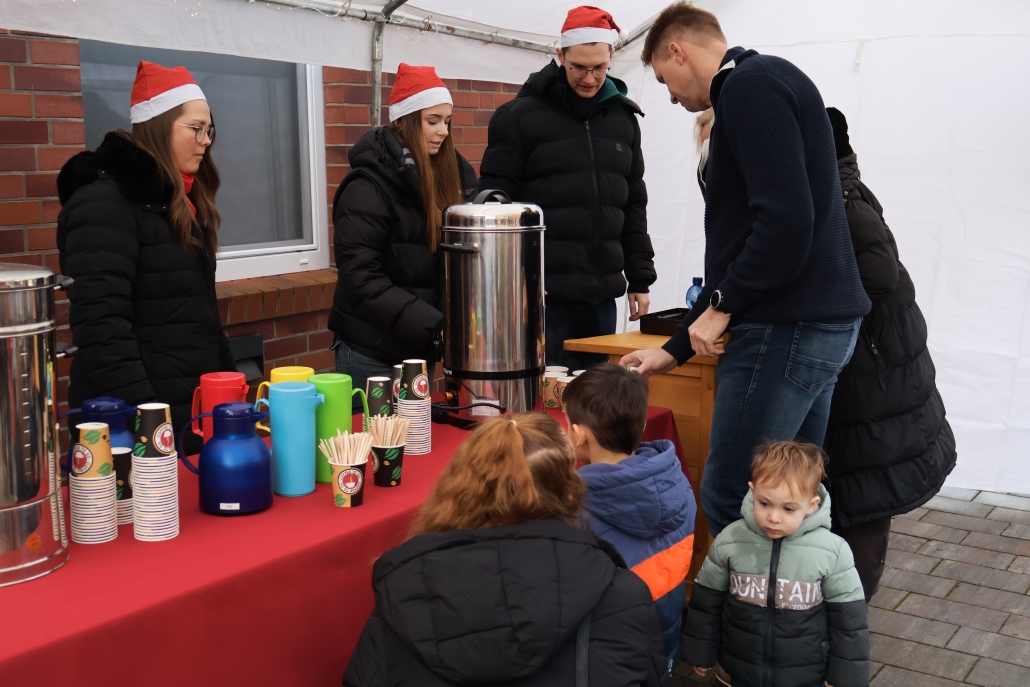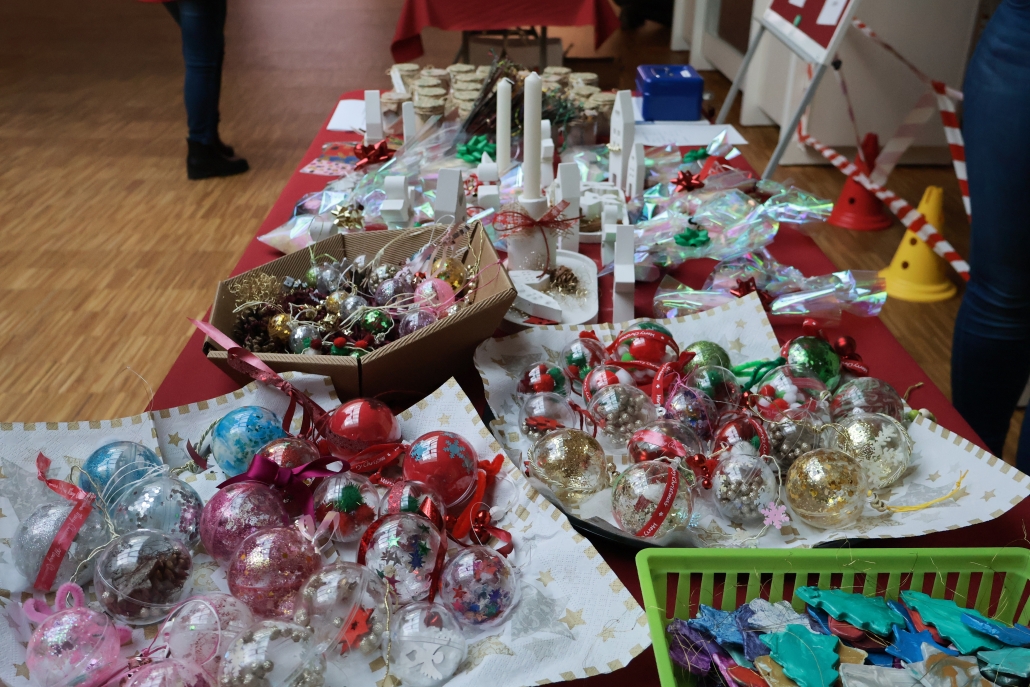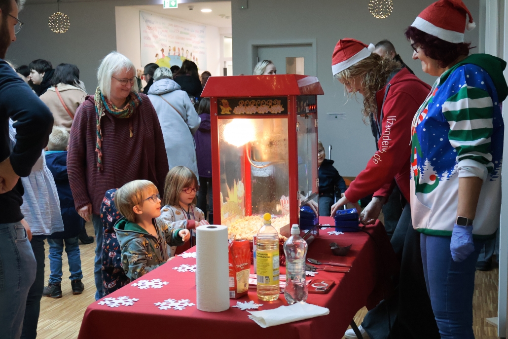 DIeses Jahr feierten wir die Weihnachtsfeier mit den Kindern wie auf einem Weihnachtsmarkt. Es gab einen Weihnachtsparcour, Popcorn, Bratwurst, Waffeln, Kinderpunsch, Kakao, Tee, Kaffee und selbstgebackene Kekse. Die Kinder haben vorab gebastelt und auch dies konnte man kaufen. In der Halle konnte man über dem Beamer Fotos der Kinder sehen. Es war ein schöner Vormittag mit netten Gesprächen und viel Kinderlachen.